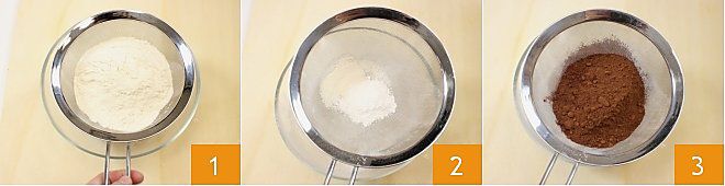 Pour préparer les carrés sucrés au chocolat et à la bière, commencez par tamiser dans un bol la farine 1, avec la levure 2 et le cacao amer 3.