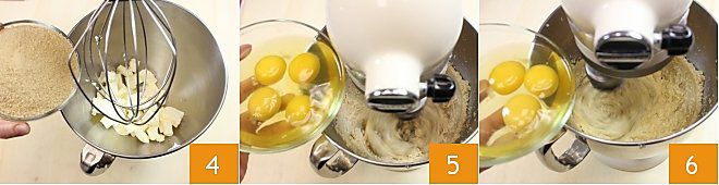 Ensuite, mettez dans un robot pâtissier équipé d'un fouet, vous pouvez également utiliser un batteur électrique, le beurre ramolli à température ambiante et ajoutez le sucre de canne 4, actionnez le robot et travaillez le tout jusqu'à obtenir un mélange crémeux. Ajoutez les œufs un par un, toujours avec le robot en action, en veillant à ajouter l'œuf suivant seulement lorsque le précédent sera complètement absorbé dans la pâte (5-6).
