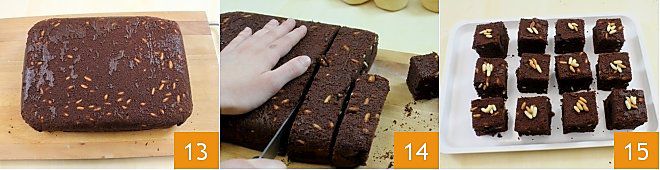 Quand le gâteau sera complètement froid, démoulez-le en le retournant sur une planche à découper 13 et coupez-le en bandes de 5 cm d'épaisseur puis réduisez chaque bande en petits carrés pour obtenir des cubes de 5x5 cm 14, puis disposez sur chaque carré sucré au chocolat et à la bière quelques pignons de pin 15 et servez !