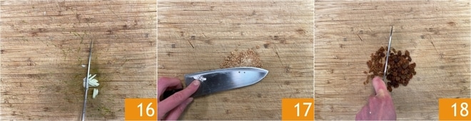 Hachez également finement l'ail après l'avoir épluché et enlevé le germe 16. Émiettez les amaretti ou écrasez-les en les pressant avec la lame d'un couteau 17. Enfin, hachez finement les raisins secs 18.
