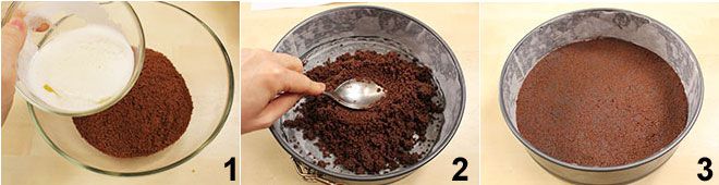 Pour préparer le cheesecake au triple chocolat, commencez par préparer le fond : mettez les biscuits au cacao dans le mixeur puis broyez-les finement. Faites fondre le beurre dans une petite casserole; entre-temps, mettez les biscuits broyés dans un bol et ajoutez progressivement le beurre fondu 1 en mélangeant bien le tout. Beurrez un moule à gâteau, de préférence à charnière, d'un diamètre de 22 cm; à ce stade, vous pouvez tapisser le moule avec du papier sulfurisé : découpez un disque de papier sulfurisé du même diamètre que le fond du moule et deux bandes de la même hauteur que les bords, puis tapissez le moule lui-même. Versez les biscuits émiettés dans le moule recouvert de papier sulfurisé 2 et avec l'aide d'une cuillère, compactez bien le fond de biscuit 3. Laissez refroidir le mélange au réfrigérateur pendant une demi-heure ou au congélateur pendant une dizaine de minutes.