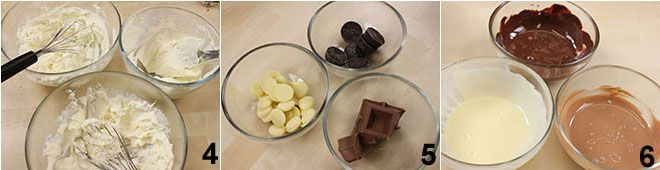 Maintenant, occupez-vous de la garniture : préparez trois bols pour les trois crèmes et mettez dans chacun 250 g de fromage frais à tartiner, mélangez pour l'assouplir 4. Pendant ce temps, faites fondre au bain-marie (ou au micro-ondes) les 3 types de chocolat séparément (5-6)