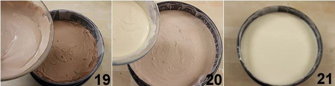 Faites la même opération pour tous les types de chocolat (16-17). Maintenant que les crèmes sont prêtes, vous pouvez composer le cheesecake, sortez du réfrigérateur le fond de biscuit désormais froid et compact, commencez à verser d'abord la crème au chocolat noir 18, laissez reposer au réfrigérateur ou au congélateur pendant 15-20 minutes.