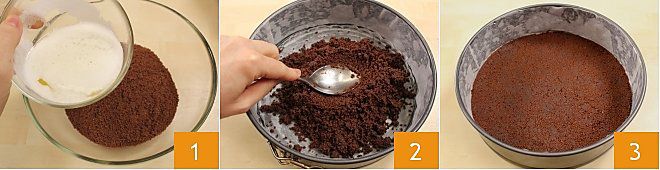 Pour préparer la cheesecake forêt noire, commencez par préparer la base : mettez les biscuits secs au cacao dans un mixeur, émiettez-les finement et transférez-les dans un bol. Faites fondre le beurre dans une casserole ou au micro-ondes et ajoutez-le petit à petit aux biscuits 1, en mélangeant bien le tout. Beurrez un moule, de préférence à charnière, de 22 cm de diamètre et tapissez-le de papier sulfurisé (pour voir comment faire, regardez ici notre École de Cuisine : tapisser un moule de papier sulfurisé). Versez les biscuits émiettés dans le moule et avec le dos d'une cuillère, tassez bien la base de biscuit 2. Laissez refroidir la base 3 au réfrigérateur pendant une demi-heure ou au congélateur pendant 15 minutes.