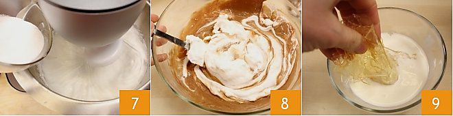 Montez les blancs d'œufs en neige avec le reste du sucre (50 g) 7 et lorsqu'ils sont bien fermes, ajoutez-les à la crème au chocolat, en mélangeant le mélange avec une spatule de haut en bas, pour ne pas casser les blancs d'œufs 8. Ramollissez 12 g de gélatine dans de l'eau froide pendant 10 minutes, essorez-la et faites-la fondre dans 2 cuillères à soupe de chantilly chaude 9. Si vous voulez en savoir plus sur l'utilisation de la gélatine, Comment utiliser la gélatine notre École de Cuisine : comment utiliser la gélatine.