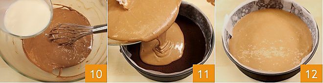 Lorsque la chantilly sera à température ambiante, ajoutez-la à la crème 10 et mélangez jusqu'à obtenir un mélange homogène. Reprenez la base de biscuits, qui sera bien ferme, et versez dessus la moitié de la crème au chocolat 11, en l'étalant de manière uniforme 12. Laissez reposer le tout au réfrigérateur pendant au moins une demi-heure ; couvrez la crème au chocolat restante avec du film plastique et mettez-la de côté dans un endroit frais (pas au réfrigérateur sinon elle se solidifiera trop).
