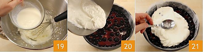 Lorsque la chantilly avec la gélatine sera à température ambiante, incorporez-la à la chantilly montée en neige 18 et mélangez. Reprenez le gâteau et formez maintenant la couche de crème à la chantilly : versez la crème sur les cerises 20 et étalez-la uniformément en vous aidant du dos d'une cuillère 21. Remettez la cheesecake au réfrigérateur pendant encore une demi-heure.