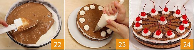 Après le temps nécessaire, versez sur la base la crème au chocolat restante 22, en formant une couche uniforme avec une spatule. Mettez la cheesecake à raffermir au réfrigérateur pour la dernière fois, encore une demi-heure. Après ce temps, votre cheesecake forêt noire est prête à être décorée : pressez des touffes de chantilly avec une poche à douille munie d'une douille étoilée 23 et décorez-la à votre guise avec des cerises à l'alcool ou fraîches et des vermicelles de chocolat 24.