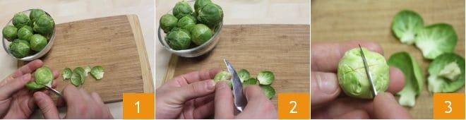 Pour préparer les choux de Bruxelles braisés à la bière, commencez par retirer les feuilles les plus externes des choux 1, éliminez la partie inférieure saillante 2 et incisez-les en formant une croix avec le couteau 3.