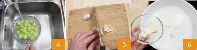 Lavez bien les choux sous l'eau courante 4 et laissez-les égoutter. Épluchez et émincez l'échalote 5, puis faites-la dorer dans une poêle antiadhésive avec le beurre 6.