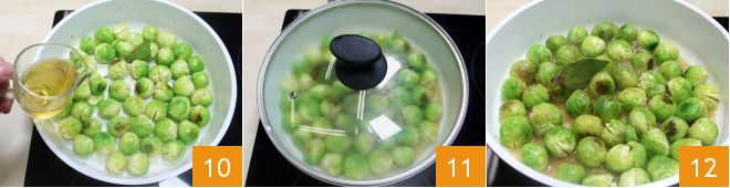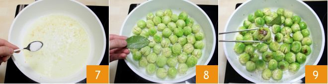 Dès que l'échalote est bien dorée, ajoutez le sucre 7 et immédiatement après, ajoutez aux choux une feuille de laurier 8 et faites-les sauter à feu vif pendant 5 minutes, jusqu'à ce qu'ils soient bien braisés 9.
