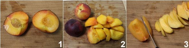 Pour préparer le clafoutis aux pêches, commencez par préchauffer le four à 180 °C. Lavez les pêches, coupez-les en deux ou en quartiers, retirez le noyau et épluchez-les (1-2). Coupez les pêches en tranches pas trop fines 3.