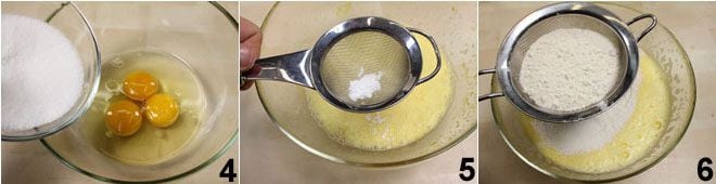 Battez dans un bol, à l'aide d'un batteur électrique, les œufs avec le sucre 4 jusqu'à obtenir un mélange clair et mousseux qui double de volume. Ajoutez la vanilline 5 et la farine 6 en utilisant un tamis