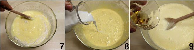 et incorporez-les au mélange avec une cuillère en bois 7. À ce stade, ajoutez, petit à petit, le lait 8 en remuant délicatement. Une fois que tout le lait a été absorbé, ajoutez le brandy 9.