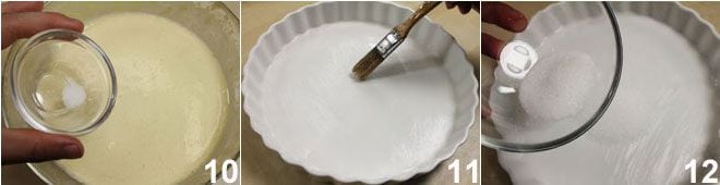 Enfin, ajoutez une pincée de sel 10 et remuez une dernière fois. Beurrez un moule à tarte, à bords bas et de 26 cm de diamètre, et saupoudrez-le de 30 g de sucre pour éviter que le clafoutis ne colle (11-12).