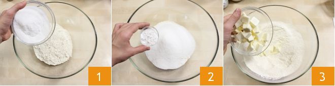 Pour préparer le cobbler aux fruits rouges, mélangez la farine 00, le sucre et la levure dans un bol, en vous aidant d'un fouet (1-2). Ajoutez 120 gr de beurre mou en morceaux 3