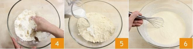 et commencez à travailler la pâte avec les mains 4, jusqu'à obtenir une consistance sableuse (si vous le souhaitez, vous pouvez effectuer cette opération avec un mixeur). À ce stade, ajoutez le lait en filet 5 et mélangez énergiquement avec un fouet pour obtenir une pâte sans grumeaux 6, puis aromatisez avec le zeste de citron râpé.