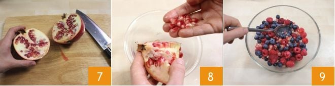 Nettoyez maintenant la grenade, coupez-la en deux 7 et égrenez-la soigneusement 8, puis ajoutez les grains juteux aux fruits rouges, dans un bol, en mélangeant le tout 9.