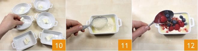 Coupez le beurre restant en morceaux (80 gr), mettez-le dans les cocottes et faites-le fondre au micro-ondes 10 (si vous n'avez pas de micro-ondes, vous pouvez faire fondre le beurre dans une casserole, à feu doux, et le verser ensuite dans les moules). Maintenant, placez environ 70 gr de pâte au fond de chaque cocotte 11, ajoutez 50 gr de fruits rouges 12