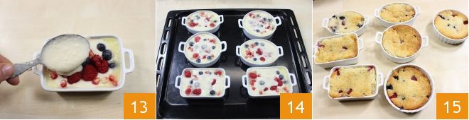 et recouvrez à nouveau avec une cuillère de pâte 13, jusqu'à couvrir tous les fruits. Disposez les cocottes sur une plaque de four et faites cuire le tout dans un four préchauffé 14, à 180° pendant 45 minutes, ou jusqu'à ce que la surface soit dorée 15. Une fois prêt, servez le cobbler aux fruits rouges tiède.