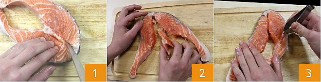 Pour préparer les médaillons de poisson, il est nécessaire de disposer de tranches épaisses d'environ 2-3 cm, dans notre cas, nous avons utilisé le saumon. Tout d'abord, retirez l'arête centrale : réalisez deux entailles de chaque côté de l'os avec la pointe d'un couteau 1 retirez à la main l'arête 2, puis, en vous aidant avec une pince à épiler, éliminez les éventuelles arêtes présentes dans la chair 3. Étant donné que toutes les arêtes ne sont pas visibles, il est utile de passer une main sur le saumon pour les détecter et pouvoir les extraire facilement avec la pince.