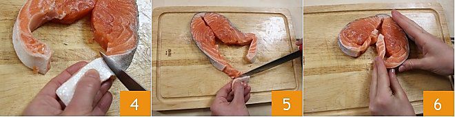 Retirez la peau présente le long des extrémités latérales externes de votre tranche de saumon en pratiquant une incision avec la pointe d'un couteau à 5-6 cm de hauteur 4, puis procédez horizontalement avec la lame pour éliminer toute la peau 5 ; en effectuant cette opération, faites attention à ne pas gaspiller trop de chair. Repliez maintenant les bords latéraux de chair sans peau vers l'intérieur 6,