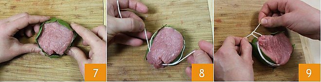 Pour rendre vos recettes plus appétissantes, il est possible d'aromatiser la viande avec de la pancetta ou du laurier, voici comment procéder : enroulez chaque médaillon de viande bovine avec la pancetta 4 et fixez le tout avec de la ficelle de cuisine en faisant un nœud bien serré 5, puis avec l'aide de ciseaux, éliminez l'excédent de ficelle 6.