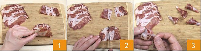 Pour préparer le cône de coppa farci sur feuilles classiques, prenez les tranches de coppa, pliez-les en deux 2 et coupez-les en deux parties égales 2, puis formez des cônes avec chaque morceau, en enroulant la coppa sur elle-même 3.