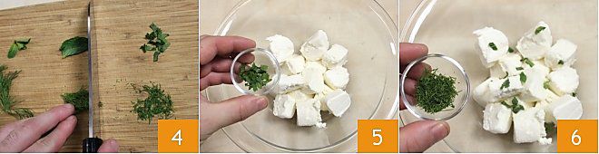 Dans un bol, mettez le fromage de chèvre et hachez finement la menthe et l'aneth, à l'aide d'un couteau 4, puis ajoutez les herbes aromatiques au fromage (5-6). Mélangez bien pour amalgamer tous les ingrédients, puis salez et poivrez à votre goût 7.