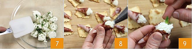 Transférez le mélange dans une poche à douille avec une pointe étoilée, puis remplissez chaque cône avec la crème de chèvre aux herbes 8. Déposez un cône sur chaque feuille et garnissez avec une petite feuille de menthe et de l'aneth comme le montre la photo 9. Le cône de coppa farci sur feuilles classiques est prêt 9, nous vous conseillons de le servir et de le déguster immédiatement!
