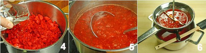 Mettez la casserole sur le feu, ajoutez le verre d'eau à la pulpe des figues de Barbarie 4. Portez à ébullition jusqu'à ce que les cubes de figues soient bien écrasés 5, puis retirez la casserole du feu et passez la pulpe au tamis pour éliminer les graines 6.