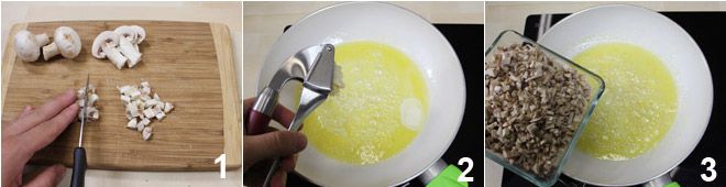 Pour préparer les coquilles Saint-Jacques au vin, commencez par laver et sécher très bien les champignons. Coupez-les finement 1 et faites-les revenir dans une poêle où vous aurez fait fondre le beurre, un filet d'huile d'olive extra vierge et l'ail écrasé (2-3).