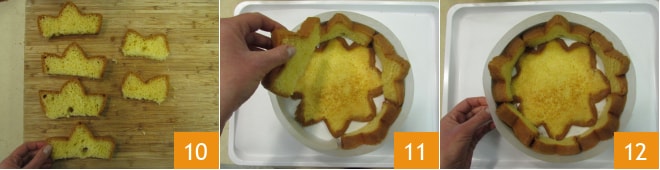 Une fois toutes les pointes obtenues 10, disposez-les dans le moule 11 et, si nécessaire, coupez les pointes pour obtenir une couronne parfaite 12.