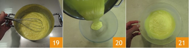 Transférez la casserole sur le feu. Faites cuire en remuant continuellement avec un fouet jusqu'à obtenir une crème lisse 19. Transférez ensuite dans un bol que vous aurez laissé refroidir dans le congélateur 20 et mélangez quelques instants pour abaisser la température de la crème 21.