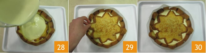 Versez la crème dans la coque de pandoro 28, placez la dernière tranche de pandoro grillée (si nécessaire, taillez les pointes avec une forme légèrement plus petite que le moule) 29, posez-la sur la crème en pressant délicatement pour compacter. Laissez raffermir au réfrigérateur pendant au moins 4 heures 30.