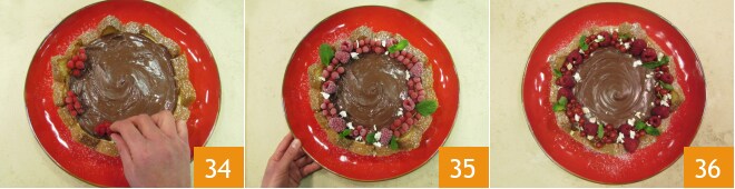 et garnissez de groseilles 34, framboises et nougat émietté 35. Complétez avec quelques feuilles de menthe et votre couronne de pandoro avec Nutella® est prête 36 !
