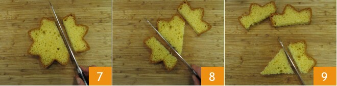 Avec les tranches non grillées, créez les pointes de la couronne. Découpez ainsi un total de 4 morceaux avec 3 7 pointes et 2 morceaux avec 2 pointes 8, si besoin vous pouvez les ajuster davantage en fonction du moule et de l'épaisseur des tranches 9.