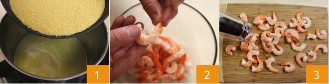 Pour préparer le couscous aux pois et crevettes, commencez par prendre le couscous ; dans une casserole versez 270 ml d'eau, chauffez-la et ajoutez une bonne pincée de sel, deux cuillères à soupe d'huile d'olive extra vierge et le zeste d'un citron. Lorsque l'eau commence à bouillir, ajoutez le couscous en pluie 1, mélangez puis éteignez le feu. Ajoutez le beurre et nivelez bien le couscous avec une cuillère et laissez reposer 2 minutes pour que la semoule absorbe l'eau. Décortiquez les crevettes 2, en retirant également la queue ; salez et poivrez 3