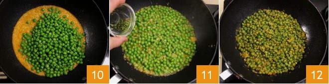 et continuez à cuire à feu doux pendant 5 minutes. Ajoutez les pois 10 salez et poivrez légèrement 12. Ajoutez aux pois une partie du mélange d'herbes 11 et cuisez environ 10 minutes jusqu'à ce que les pois soient tendres 12 en ajoutant un peu d'eau s'ils deviennent trop secs.