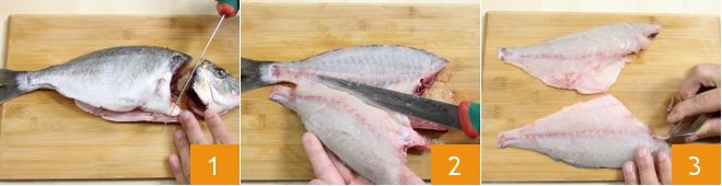 Pour préparer le couscous avec légumes et boulettes de poisson, commencez par faire bouillir une pomme de terre. Ensuite, consacrez-vous au nettoyage de la dorade : pour effectuer cette opération délicate au mieux, consultez notre École de cuisine : Comment nettoyer la dorade. Après avoir vidé et écaillé la dorade, éliminez également les branchies. Munissez-vous d'un couteau à fileter le poisson et incisez la tête, en l'éliminant 1. Continuez en incisant la queue et la partie dorsale du poisson le long de la colonne vertébrale : commencez par le haut et continuez en déplaçant la lame horizontalement par rapport au plan de travail pour obtenir le premier filet 2. Séparez les deux moitiés du poisson et continuez de la même manière, en détachant cependant la chair de l'arête pour obtenir le second filet (faites attention à ne pas enlever trop de chair lors de cette opération). Éliminez toutes les arêtes éventuelles avec une pince à épiler 3, aidez-vous ensuite en passant une main sur la chair pour les identifier, puis retirez la peau avec précaution à l'aide d'un couteau, pour ne pas gaspiller la chair du poisson.