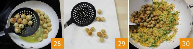 La cuisson sera assez courte, les boulettes de poisson doivent juste dorer. Quand la surface sera dorée, égouttez-les avec une écumoire 28 et laissez-les sécher sur un plateau recouvert de papier absorbant afin d'éliminer l'excès d'huile 29. Une fois sèches, versez les boulettes de poisson dans la poêle avec le couscous et les légumes 30.