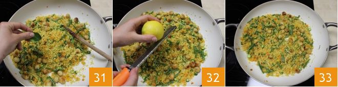 Assaisonnez le tout en ajoutant quelques feuilles de menthe 31 et en râpant le zeste d'un demi-citron 32. Mélangez et votre couscous avec légumes et boulettes de poisson est prêt à être servi 33!