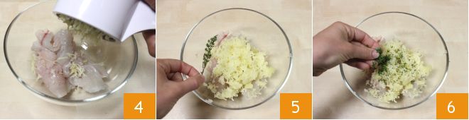 Coupez la chair de dorade en morceaux et transférez-la dans un bol ; il vous en faudra 260 g. Une fois la pomme de terre cuite, pelez-la et écrasez-la directement dans le bol avec un presse-purée 4. Salez et poivrez à votre goût, puis ajoutez les feuilles de thym et le persil hachés (5-6).
