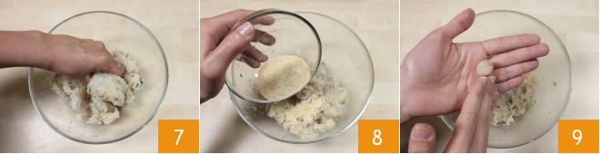 Pétrissez le mélange à la main 7, ajoutez la chapelure et travaillez encore 8. Puis formez des petites boulettes d'environ 5 g chacune 9.