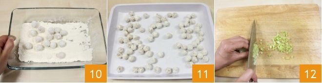Versez un peu de farine dans un bol et farinez les boulettes 10. Ensuite, transférez-les sur un plateau et conservez-les au réfrigérateur jusqu'à ce que vous deviez les frire 11. Préparez maintenant les légumes pour le couscous : commencez par laver soigneusement le céleri et le hacher finement 12.
