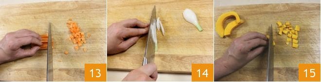 Lavez et épluchez une carotte avec un économe et hachez-la 13, épluchez un oignon nouveau et émincez-le 14. Ensuite, éliminez la peau et les graines internes de la courge et coupez-la en dés 15.