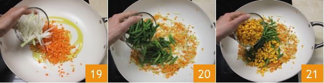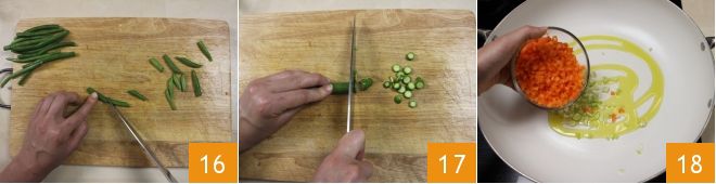 Lavez soigneusement les haricots verts sous l'eau courante, éliminez les extrémités et coupez chaque haricot en trois morceaux 16. Enfin, coupez les petites courgettes en rondelles, après les avoir lavées et séchées 17. À ce stade, prenez une grande poêle antiadhésive, versez un filet d'huile et ajoutez le céleri et les carottes hachés 18.