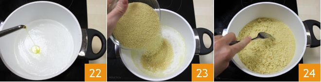 Maintenant, consacrez-vous au couscous : remplissez une grande casserole d'eau, salez-la et ajoutez un filet d'huile 22. Une fois l'ébullition atteinte, versez le couscous 23 et laissez cuire pendant 5 minutes en couvrant avec un couvercle. Passé ce temps, le couscous aura absorbé une grande partie de l'eau de cuisson, doublant ainsi son volume 24.