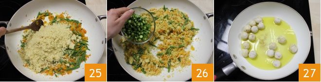Transférez-le dans la poêle où vous avez cuit les légumes 25, ajoutez les rondelles de petites courgettes 26 et laissez cuire pendant environ 2 minutes. Pendant ce temps, faites cuire les boulettes de poisson : versez un filet d'huile abondant dans une poêle antiadhésive et quand il est bien chaud, faites frire les boulettes de dorade 27.