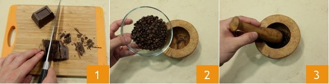 Pour préparer la crème de café, hachez le chocolat noir au couteau 1 et mettez-le de côté ; placez les grains de café dans un mortier 2 et écrasez-les assez grossièrement 3 ;